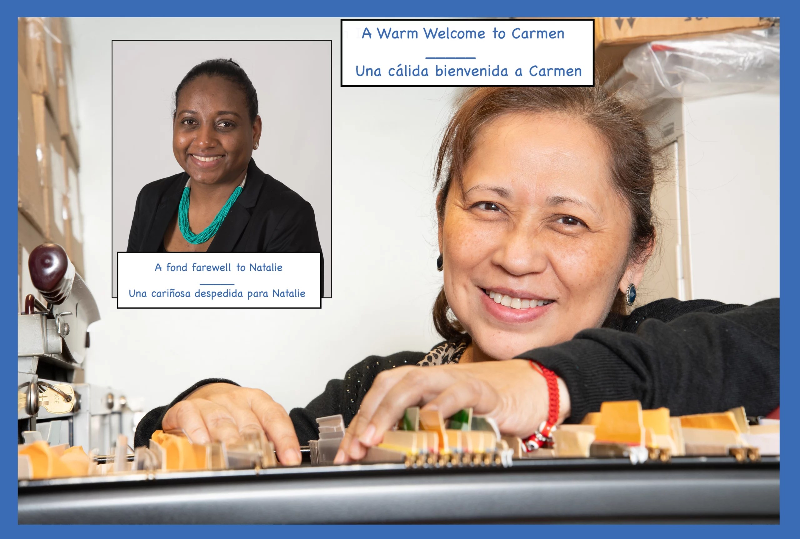 Por otro lado tuvimos mucha suerte de encontrar a Carmen Colmenares-Fuentes para que fuera ella quien ocupara el lugar de Natalie. Carmen llegó a los Estados Unidos desde Perú en 1987 y crió a sus dos hijas en el vecindario. Su hija Pamela empezó como una pasante en nuestros salones de clases el año pasado y recibió un certificado de estudiante de honor de BMCC. Pamela comenzó a trabajar para nosotros como maestra sustituta en la primavera pasada. Ella continuará con sus estudios en Educación Infantil a partir del próximo semestre, la extrañaremos mucho.